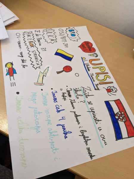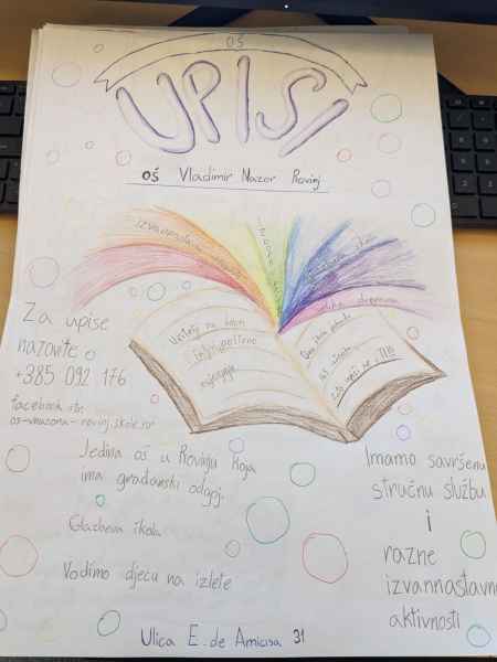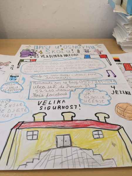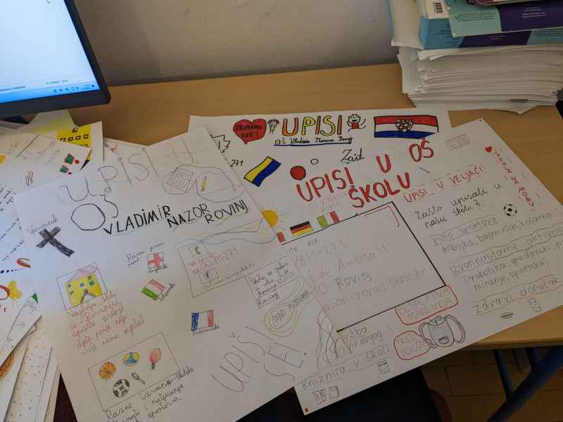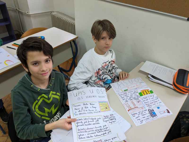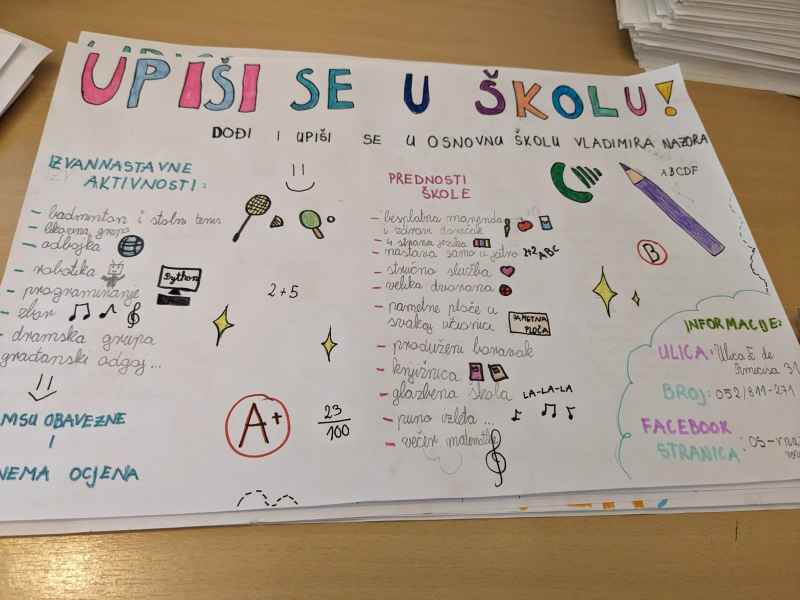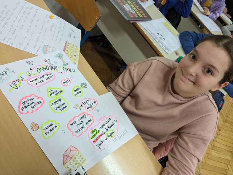 U sklopu predmeta Hrvatski jezik i nastavne jedinice pod nazivom Plakat kao prenositelj informacija; učenici 5. razreda naše škole izrađivali su plakate. Izradom plakata aktivno su se uključili u trenutna događanja u našoj školi – upisi u prvi razred osnovne škole. Učenici su pokazali svoj istraživački, kreativan i poduzetnički duh te su oduševili pomno izrađenim plakatima! Učenici su pisali sve što je njima važno da jedna škola nudi i zaista svi možemo biti ponosni kada pogledamo što su oni navodili. Također, proveli su anketu (na uzorku od 44 učenika ) i došli do zanimljivih rezultata. Zaključujemo da su učenicima najvažnije izvannastavne aktivnosti, potom biti viđeni na netu, hrana te učitelji i stručna služba škole.